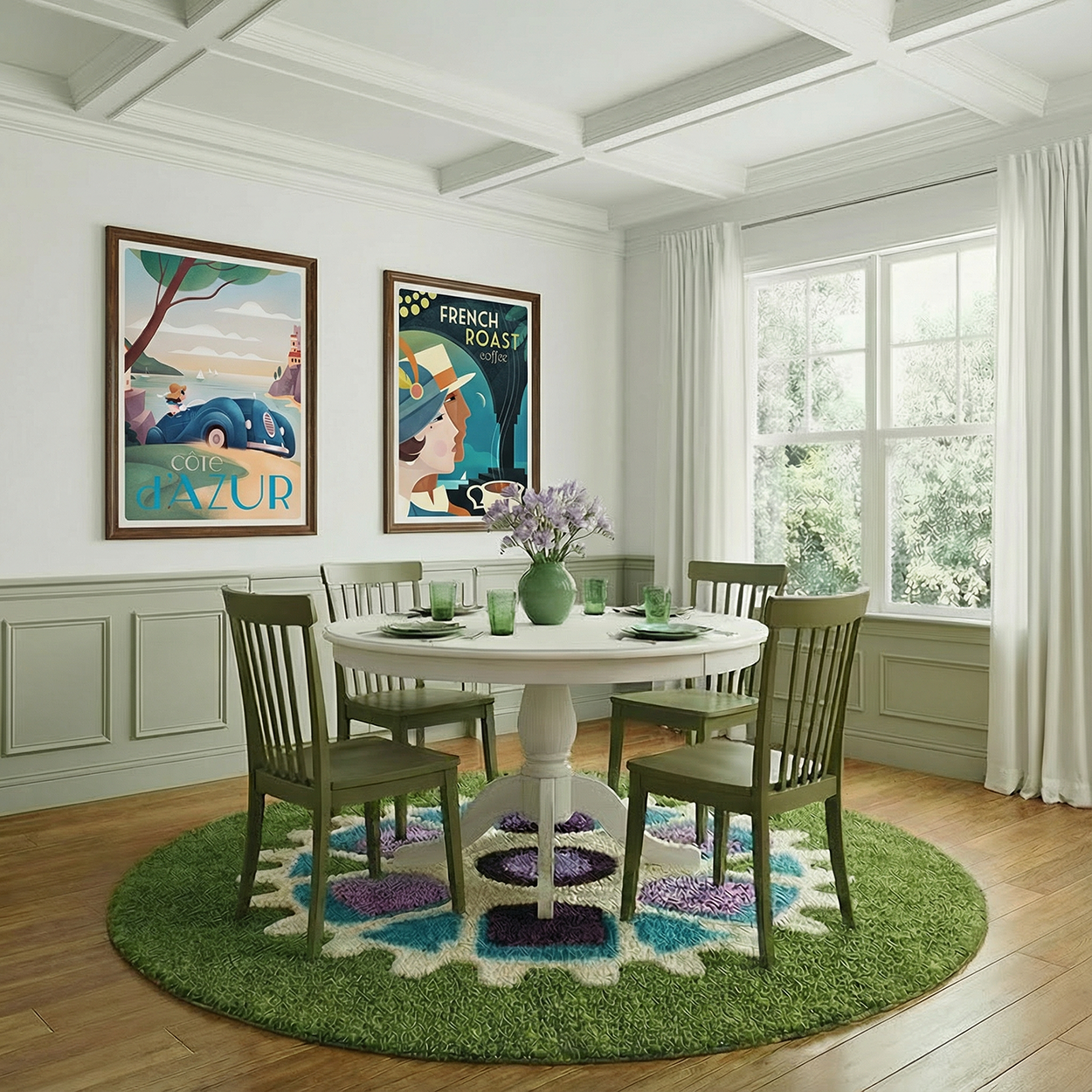 An oversized sample (2' x 2', 1' x 1' or 1' x 4' depending on the design) shows yarn colors and a section of the design. You can hold your sample up against your furnishings in your room.